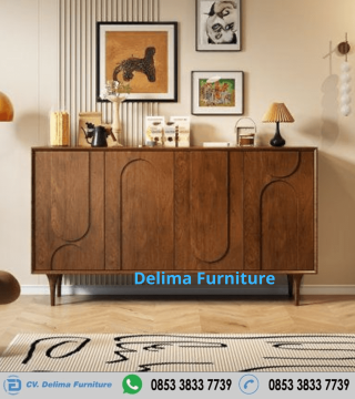 Desainnya yang minimalis terlihat dari garis-garis bersih dan bentuk yang fungsional. Namun, keunikan **credenza kayu minimalis modern** ini terletak pada ukiran atau relief artistik pada bagian pintu kabinetnya, yang memberikan kesan dinamis dan tidak membosankan. Ini adalah furniture yang tidak hanya praktis tetapi juga sebuah karya seni.