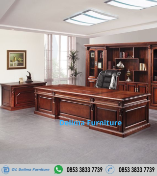 Dengan desain klasik megah, detail ukiran halus, dan finishing natural yang menawan, meja ini tidak hanya berfungsi sebagai tempat kerja, tetapi juga simbol prestise dan profesionalitas. Sangat cocok digunakan sebagai meja kerja pejabat, eksekutif, direktur, maupun anggota dewan yang mengutamakan kualitas dan estetika.