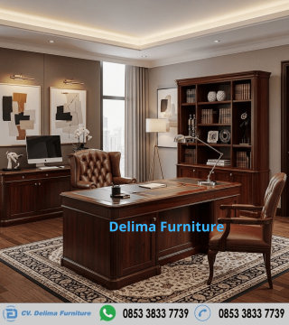 Tampilkan prestise dan profesionalisme dengan Meja Kerja Direktur Kayu Jati Executive yang dilengkapi Bookcase mewah dari Delima Furniture. Set furniture kantor premium ini dirancang khusus untuk ruang kerja direktur, CEO, dan eksekutif yang mengedepankan kelas dan elegansi.