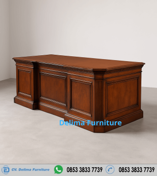 Meja ini menampilkan desain klasik yang elegan, dengan detail ukiran halus dan finishing yang menawan. Tampilannya yang megah dan berwibawa sangat cocok untuk ruang kantor direktur atau ruang kerja eksekutif. Desain ini akan menciptakan kesan profesional dan kredibel, serta meningkatkan suasana kerja yang serius dan fokus.