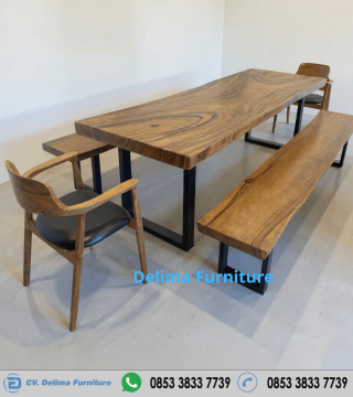 Lengkapi ruang makan Anda dengan Set Meja Makan Kayu Solid dengan Kursi dan Bangku Minimalis dari Delima Furniture. Terbuat dari kayu solid berkualitas tinggi yang tahan lama dan dipadukan dengan rangka besi hitam, set ini menawarkan perpaduan sempurna antara gaya rustic modern dan kepraktisan.